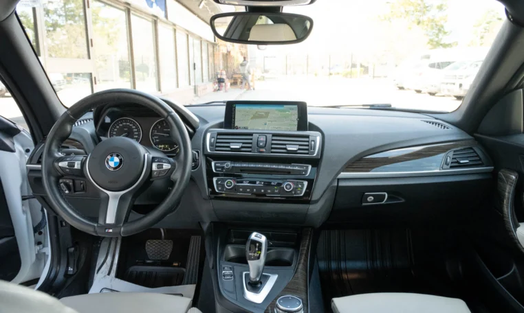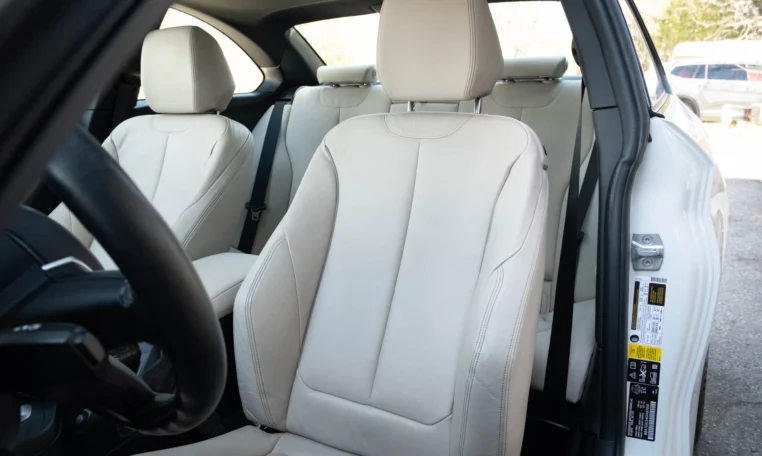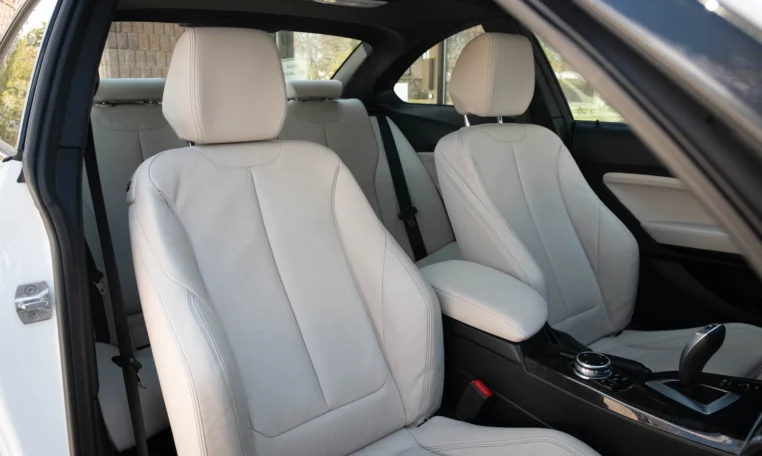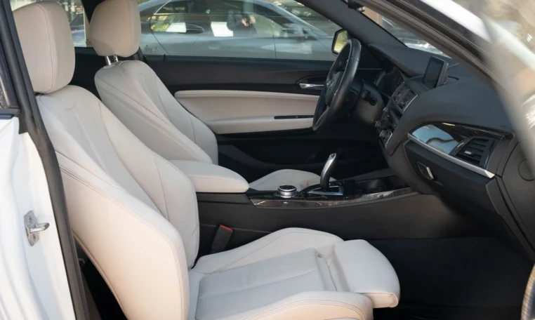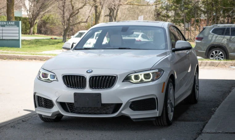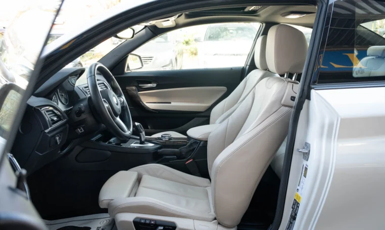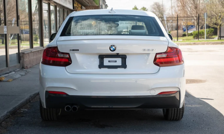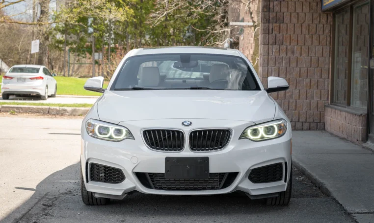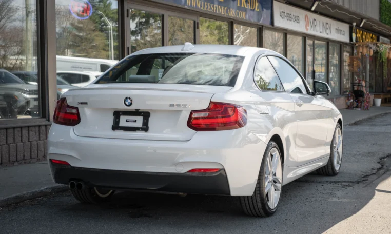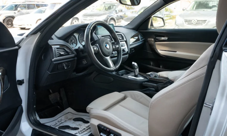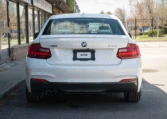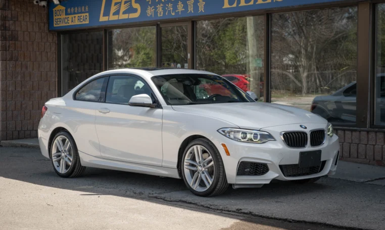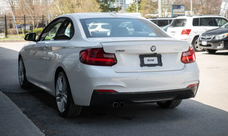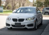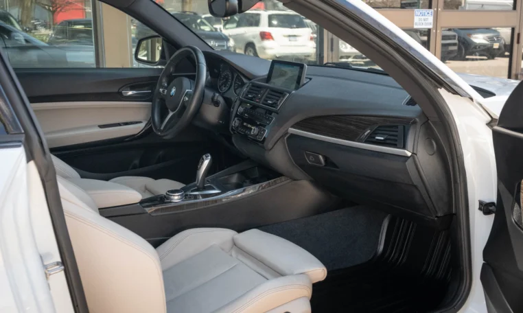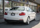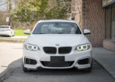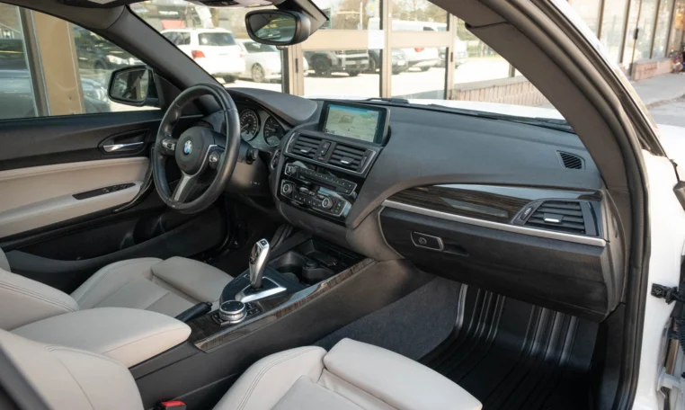 BMW 228i two-door coupe with less than 49,000 kilometers from new. Powered by a 2.0-litre turbocharged 4-cylinder engine producing 240 hp and 255 lb-ft of torque. Eight-speed automatic transmission. All-wheel-drive. Mineral white metallic on beige interior.