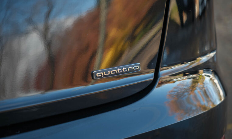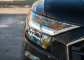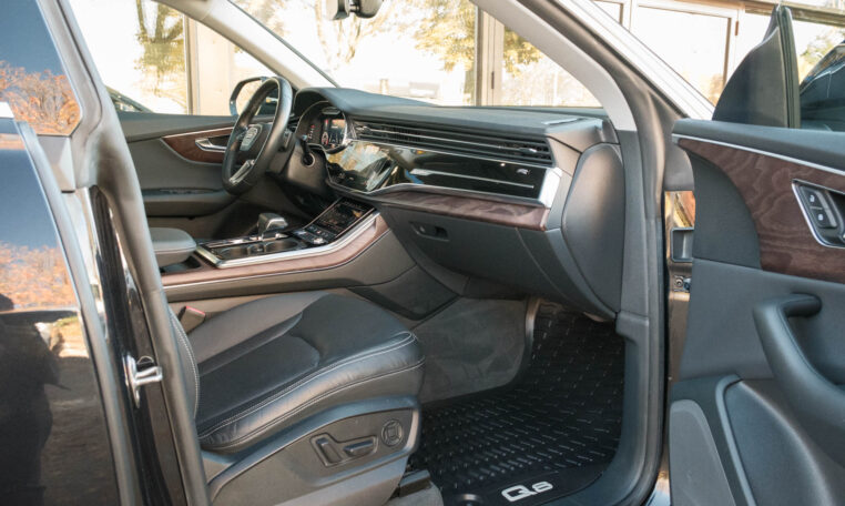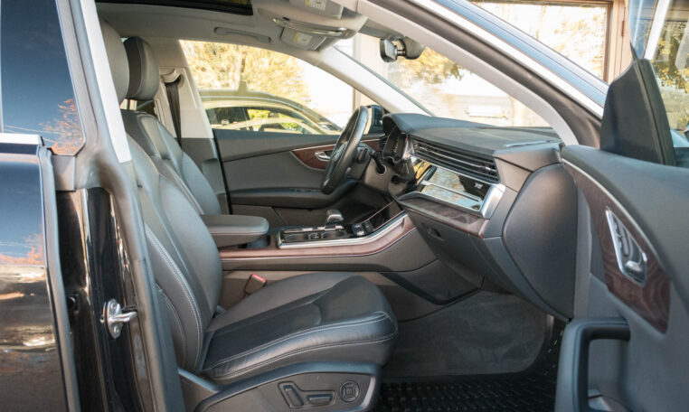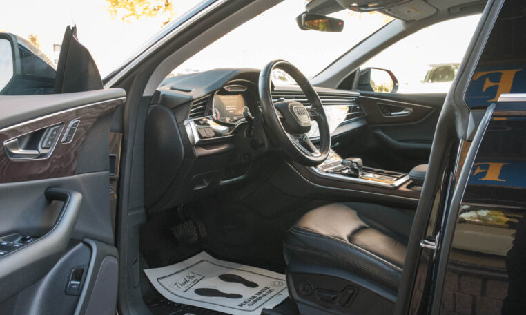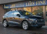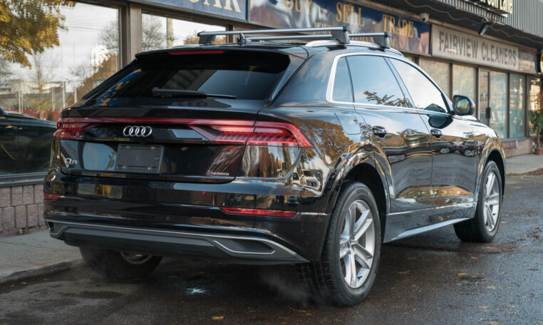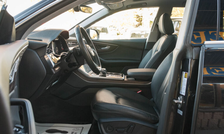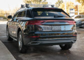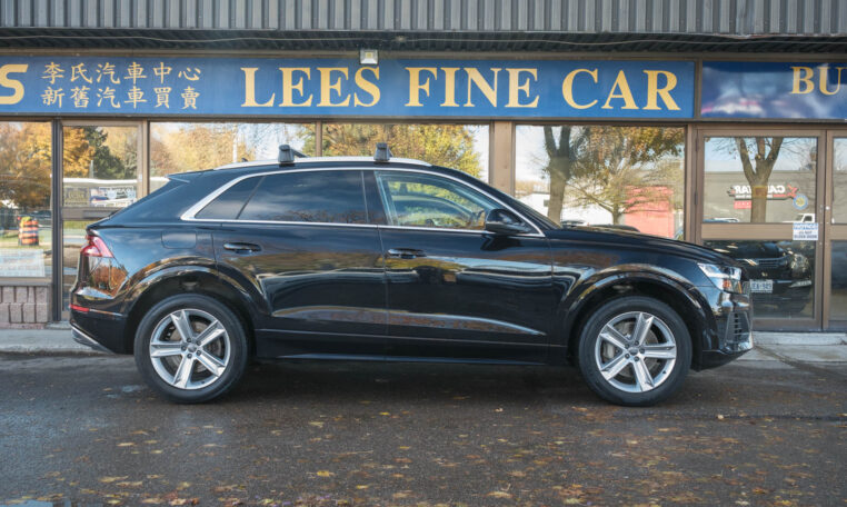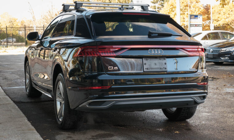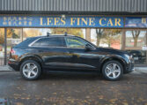 Audi Q8 coupe SUV. Powered by a 3.0-litre turbocharged V6 engine producing 335 hp and 369 lb-ft of torque. 8-speed automatic transmission. Quattro all-wheel-drive system. Orca black metallic exterior paint on black interior.