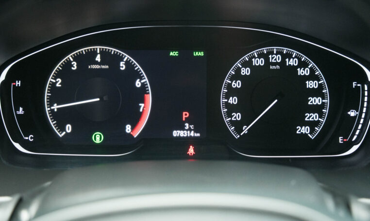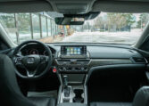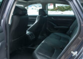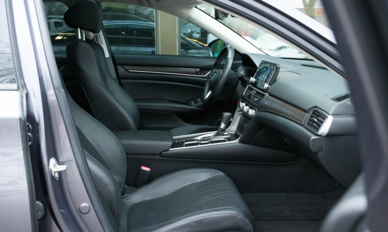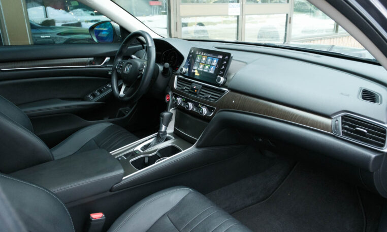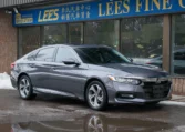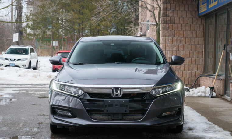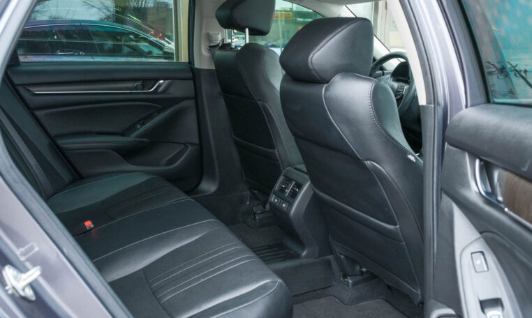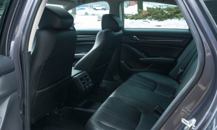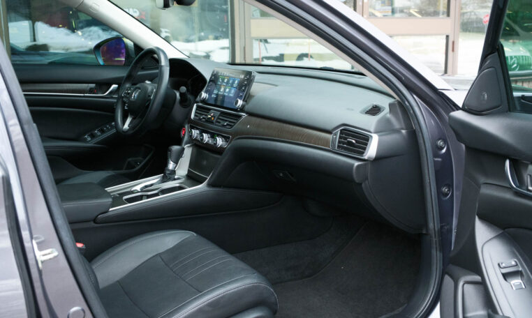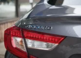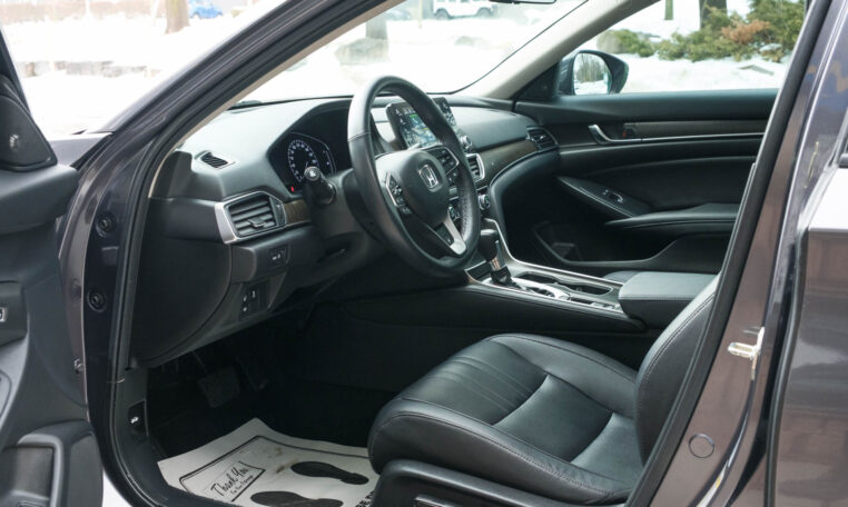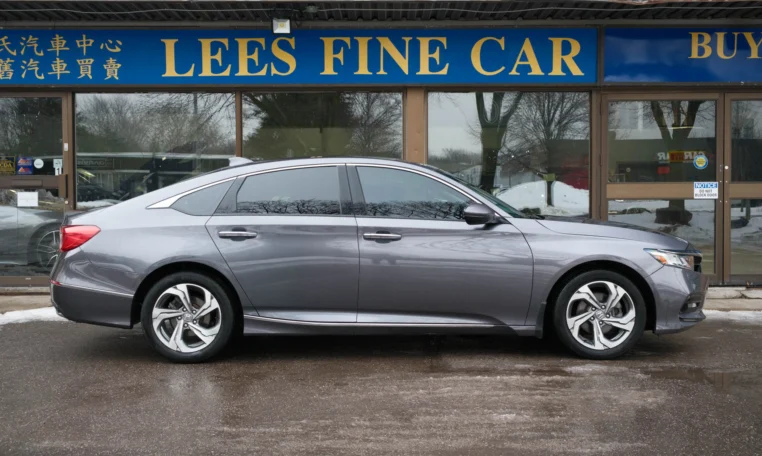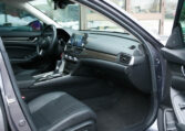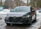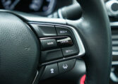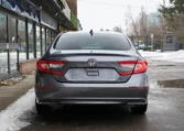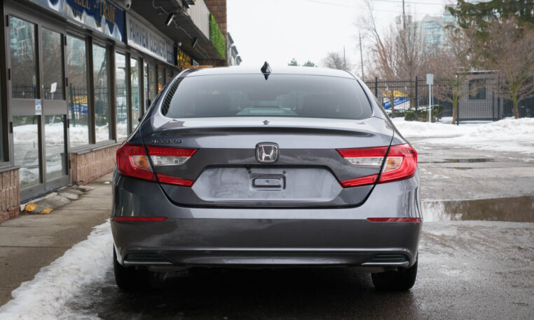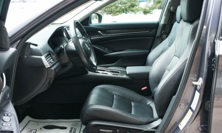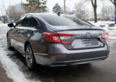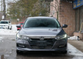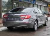 Honda Accord sedan with less than 80,000 kilometers from new. Powered by a 1.5-litre turbocharged 4-cylinder engine producing 192 hp and 192 lb-ft of torque. Front-wheel-drive. Modern steel metallic grey paint on black interior.
